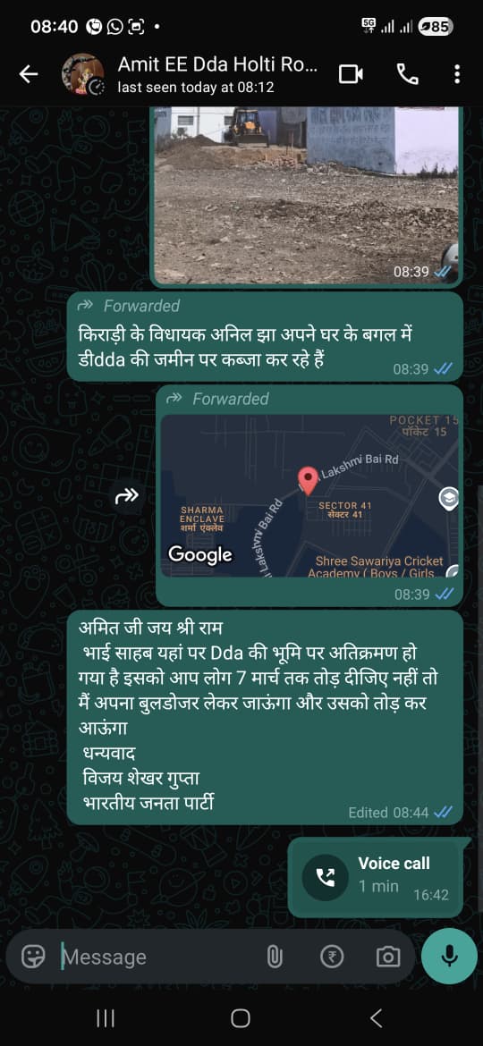 किराड़ी विधानसभा के वार्ड नंबर 37 और 39 में स्थानीय लोगों ने कथित अतिक्रमण को लेकर शिकायत दर्ज कराई थी। शिकायत के आधार पर विजय शेखर ने दिल्ली विकास प्राधिकरण (DDA) के वरिष्ठ अधिकारियों से संपर्क किया।