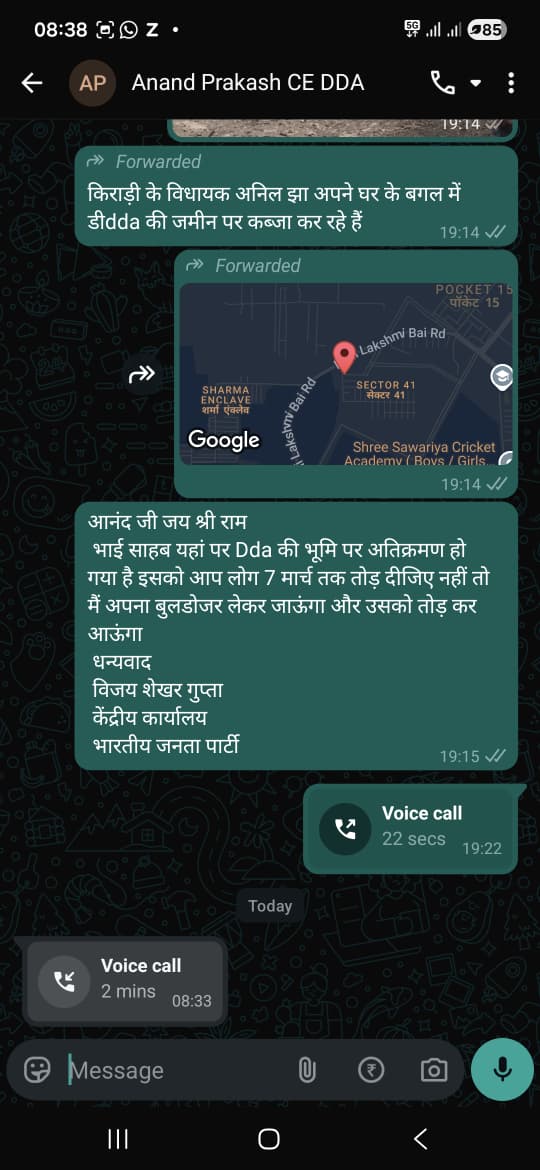 विजय शेखर ने आरोप लगाया कि अनिल झा (किराड़ी विधायक) द्वारा संबंधित भूमि पर अतिक्रमण किया गया है। हालांकि, DDA अधिकारियों का कहना है कि यह भूमि सरकारी रिकॉर्ड में निजी श्रेणी में दर्ज है।